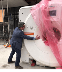 MR Ünitesinin inşaatı için cihaz yüklenici firması Siemens, inşaat yüklenici firması ve gazi yapı işleri yetkileri ile neredeyse ayda bir şantiyede toplandık. Tutanak altına alınan bu toplantılarla amaç süreci en sağlıklı bir şekilde yönetmekti. MR cihazını getirmek için verdiğimiz mücadele, hayatımın en zorlu süreçlerinden biriydi. 10 Mayıs 2023 sabahı MR’ımız bir tırla gelip bir vinçle indirildi, ilginç bir şekilde odanın içine itilerek sokuldu. Sonunda cihazın başarıyla kurulduğunu gördüğümde hissettiğim mutluluğu ve gururu kelimelerle anlatmak gerçekten çok zor (belki aşağıdaki fotoğraf bir fikir verir).